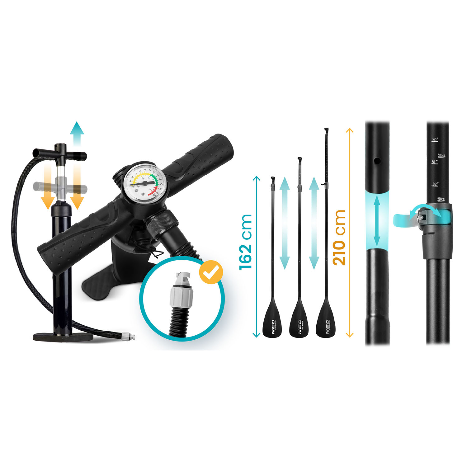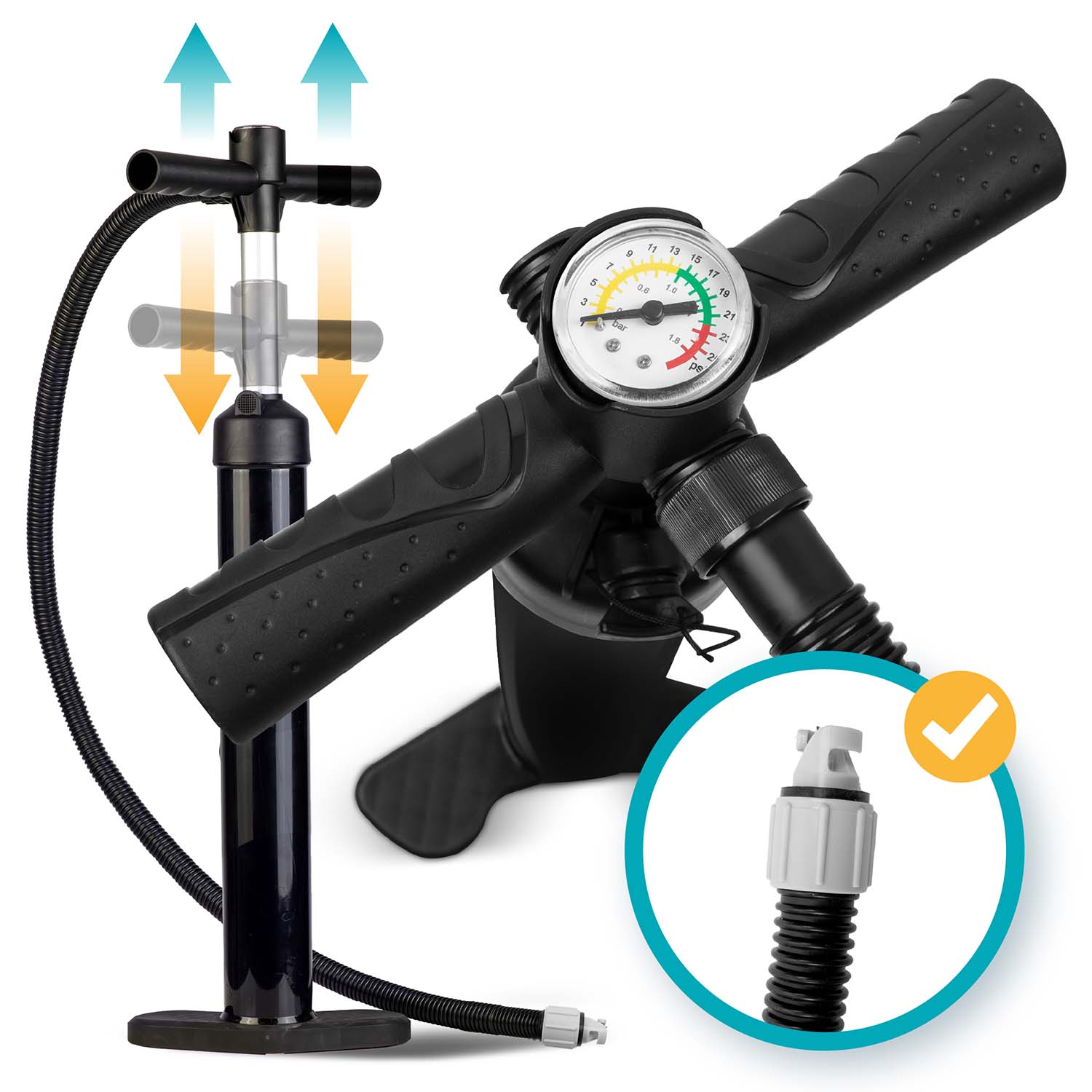 ✅ Dwukierunkowe pompowanie – tłoczy powietrze zarówno przy nacisku, jak i unoszeniu tłoka – szybciej napompujesz deskę.