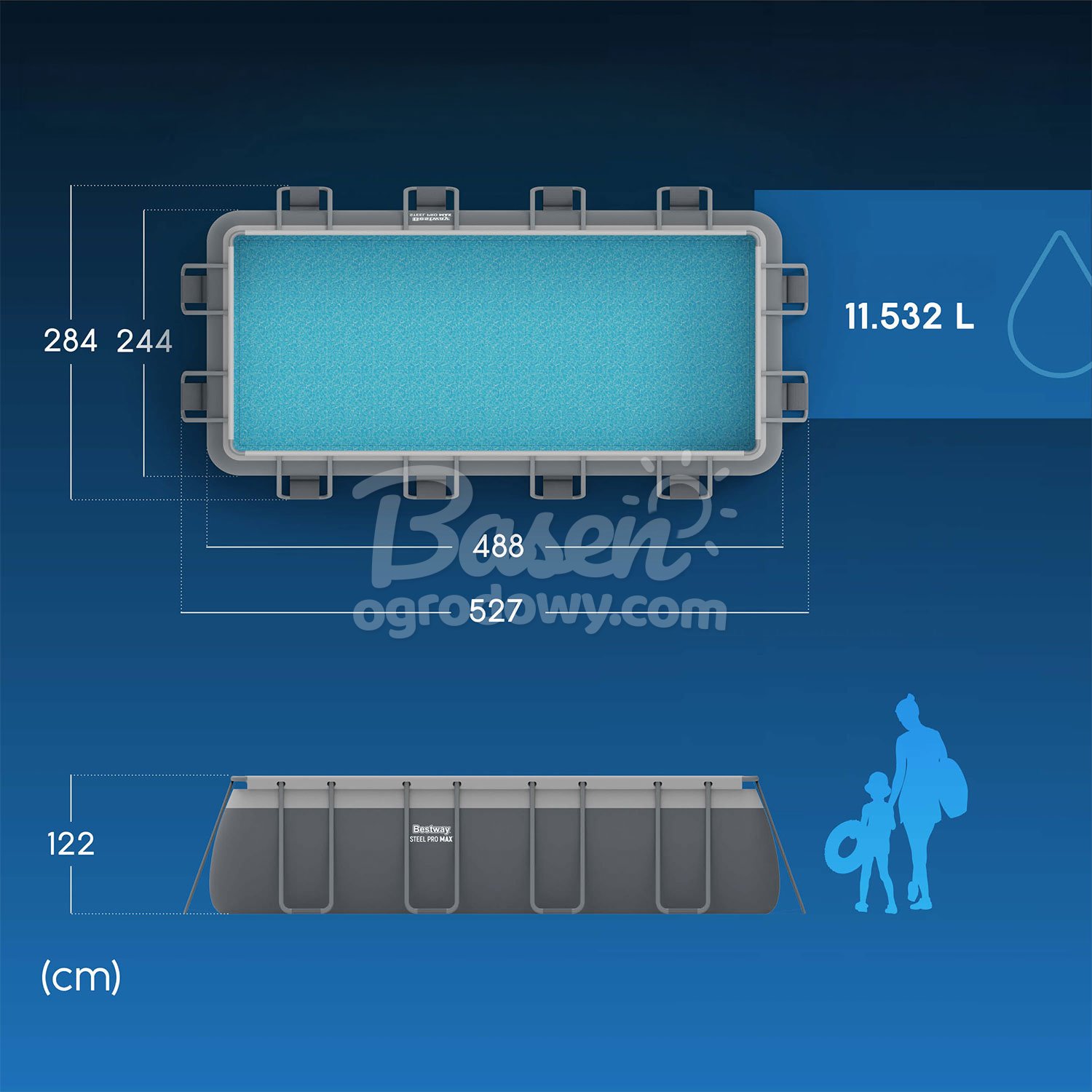 - Wymiary zewnętrzne basenu 527 x 284 x 122 cm