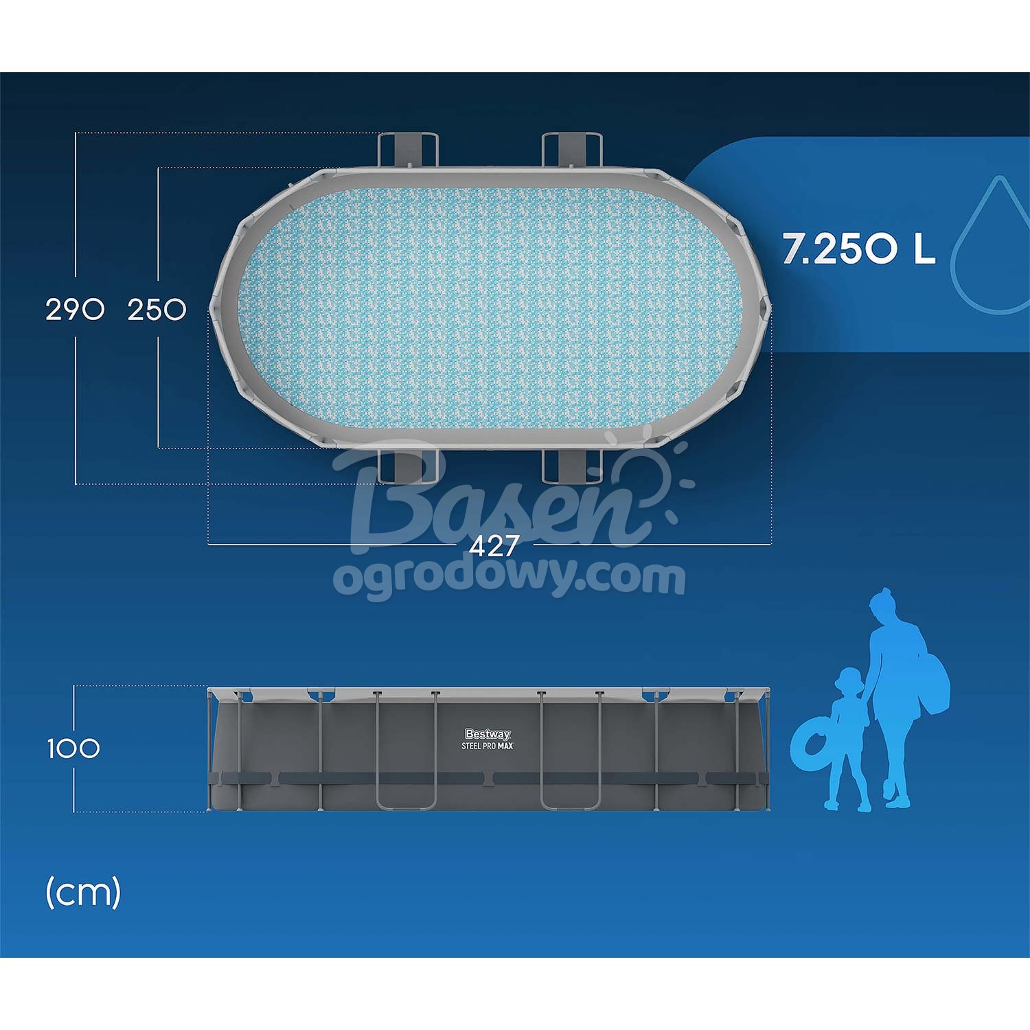 - Wymiary zewnętrzne basenu 427 x 290 x 100 cm