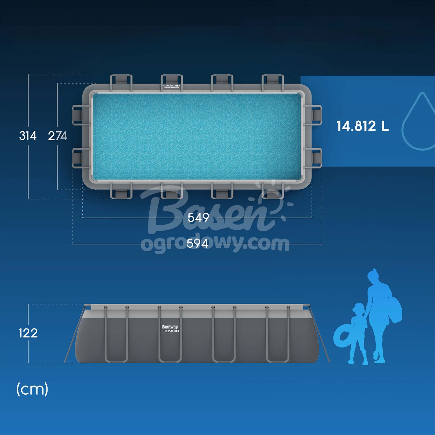 - Wymiary zewnętrzne basenu 594 x 314 x 122 cm